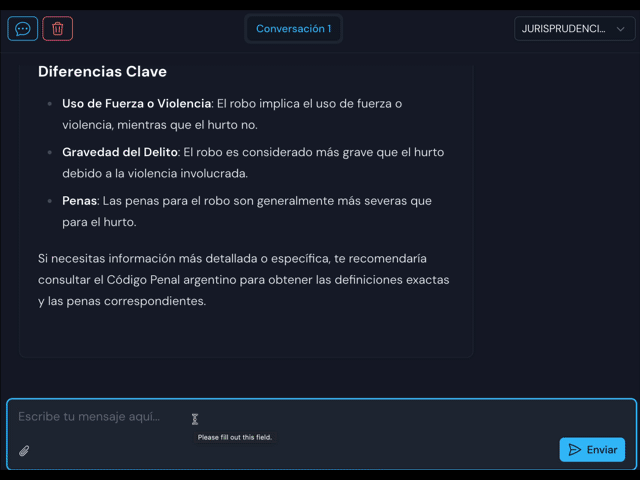 Legal IA es una poderosa herramienta de investigación jurídica, capaz de elaborar documentos argumentativos, pudiendo hacer profundos análisis basados en leyes y jurisprudencia, tanto nacionales como provinciales. Utilizando la base de datos vectorial Sadosky, LegalIA es capaz de ofrecer resultados de manera inmediata. Con gran precisión